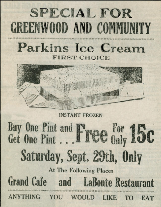 The above advertisement, featuring the availability of "Parkins Ice Cream" at the Grand Cafe and LaBonte's Restaurant, appeared in the Greenwood Gleaner, Sept. 27, 1934