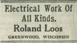 Roland Loos, respected business man in Greenwood, Wisconsin, was born July 5, 1900 in Menomonie, Dunn Co., Wisconsin. He moved to Greenwood with his parents, Rev. George and Emma Loos, in the fall of 1911. He attended the public schools and graduated from Greenwood High School in the class of 1919.