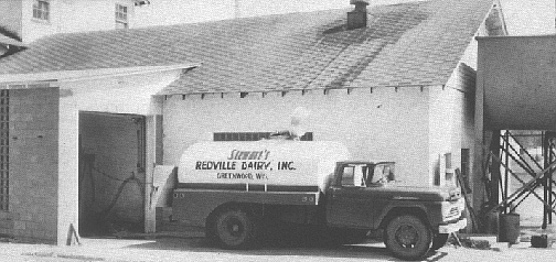 Stewart's Redville Dairy produced over 4 million pounds of Italian Provolone cheese a year (9% of Wisconsin's total output) and approximately 1 million pounds of Cheddar. Producing two varieties provided full-time employment by off-setting the 6 mo. aging process for Provolone. Costly traces of antibiotics from the farms would occasionally show up in the milk and became a "terrific financial drain" because the unprocessed milk would have to be dumped. In 1984, the plant was sold to John Plantan who operated it until July 1985 when it went out of business after he was charged with numerous felonies and two misdemeanors of operating without a license, forgery and embezzlement which led to his imprisonment. (circa 1960) |