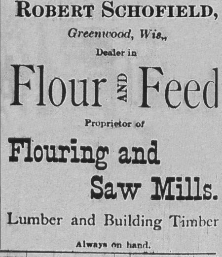 The Advertisement above appeared in "The Neillsville Times" during 1882 featuring the mills of Robert Schofield