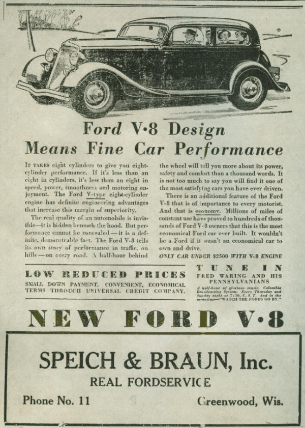 These two advertisements appeared in the Greenwood Gleaner, Oct. 4, 1934, during the height of the great depression. If you have any additional details to add, please contact us. We'd like to know how much the featured car would have cost and if it would have had a radio? Did anyone you know happen to purchase a car from Speich & Braun's Ford Dealership? If so, when and what did they buy? |
