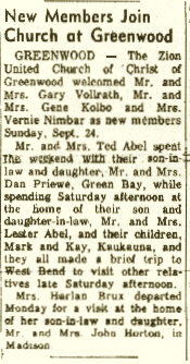 Greenwood--The Zion United Church of Christ of Greenwood welcomed Mr. & Mrs. Gary Vollrath, Mr. & Mrs. Gene Kolbo, & Mrs. Vernie Nimbar as new members Sunday September 24th. (Marshfield News Herald, date unknown).