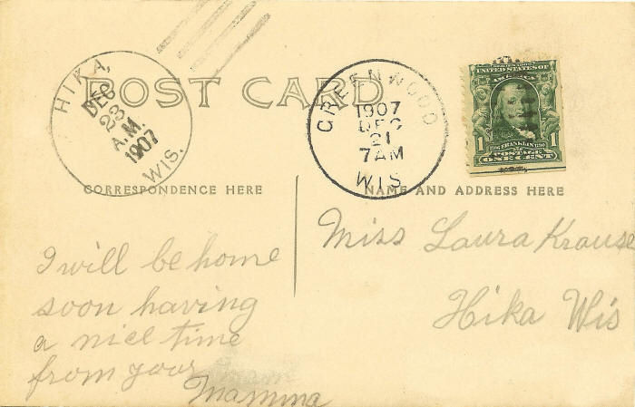 To: Miss Laura Krause, Hika, Wis., postmarked 21 Dec 1907 From: Mamma