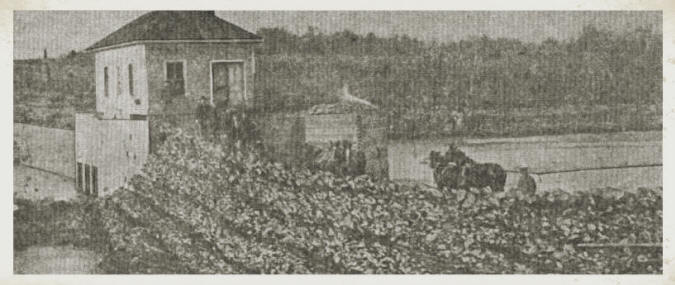 This old brush dam was located about one mile north of Greenwood, on the Black River, near the present Greenwood Park. A dam, at that site, was difficult to keep in place. The brush dam was built shortly after 1900 and went out in 1914 with the same flood that wiped out Hemlock Dam, two or three miles upstream. O’Neill Creek had a similar brush dam under the Hewett Street Bridge in 1900-1910. |