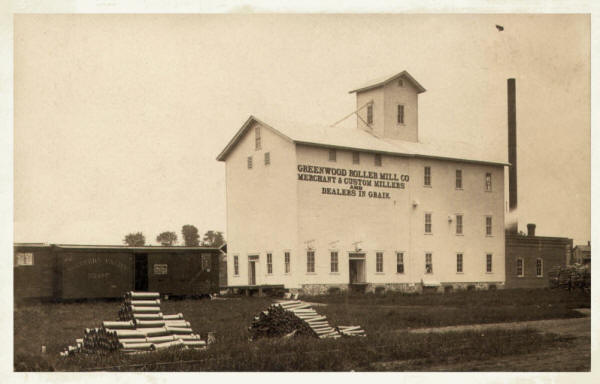 The erection of the above building was started in the fall of 1899 and was finished in the spring of 1900, and was built by the N.C. Foster Lumber Company, who conducted the business, with F. W. Shrimpton as manager, until 1902, when it was incorporated under the title of the Greenwood Roller Mill Co., with N.C. foster as President; G.A. Foster, Secretary and Treasurer, and Franklin W. Shrimpton, Business Manager, and under which title the business is now successfully conducted.
