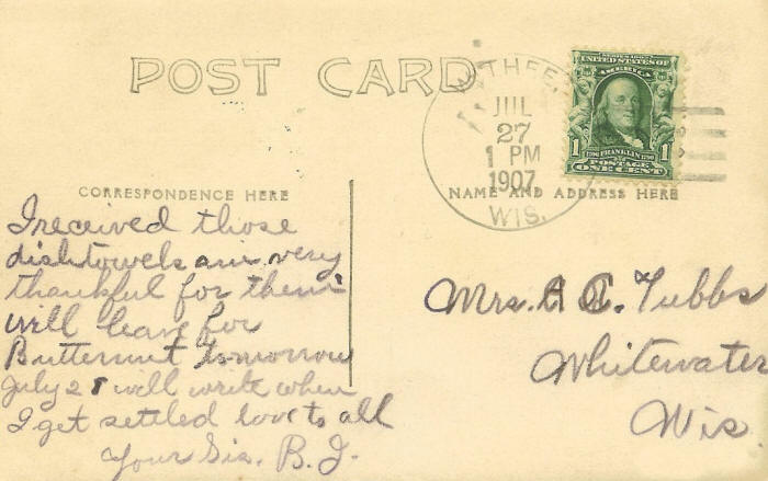 Below--Post Card Message to Mrs. A. C. Tubbs of Whitewater, Wis. from Sis., B. J.