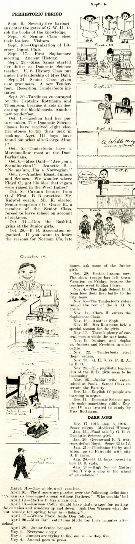 But these are generalities, characteristic of all seniors of all ages.  Our Greenwood High school Seniors represent a fine standard of young manhood and womanhood.  The faculty feels happy that they have had the opportunity of offering their mite in the molding of these characters.  They appreciate and admire the cheerfulness, the open-mindedness, and the progressiveness of the class of 1916.  Let us not flatter them by calling them extremely industrious!