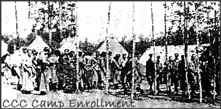 Civilian Conservation Corps Enrollment The CCC program was based on U.S. Army organizational structure, with each camp of army company size--from 166 to 215 men. Overseeing every four or five camps was an army officer who had enlisted assistants. Most military personnel were reservists who joined CCC. Many of these camps were established in Foster Township in the mid 1930s. Members planted trees to keep soft sand from blowing across the area during the dust bowl. Former CCC supervisor, Hall Smith, said sand drifts where as high as 18 inches deep during periods of high winds. More than 1,000,000 pine and spruce trees were planted by the corps. |