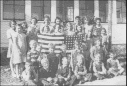 Verna Grobe, Margie Montag, holding the flag are Delores