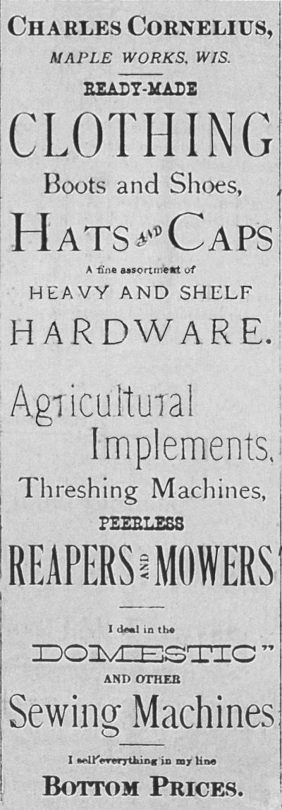 Clothing and Hardware Store owned by Charles Cornelius of Maple Works, Wisconsin.