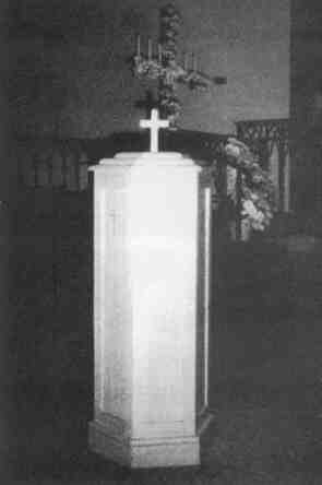 Alaine Pearl Elmhorst's baptism was the last one at this font on April 26, 1959, in the red brick church. This picture was taken of the font with Eugene and Karen Trimberger before the church was razed.