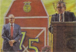 Approximately 625 people filled the Granton School Fieldhouse Oct. 17, 2015, to join in celebrating 75 years of the Granton FFA Chapter. The agriculture education department opened in the fall of 1940 and held initial agriculture courses for farm boys. At that time a local FFA chapter was also formed and the charter was issued at the state convention in June 1941. Many past FFA members and officers returned to Granton to help the current FFA and FFA Alumni members reminisce and reflect on the changes and traditions of the chapter in the past 75 years. The celebration began with a full buffet meal of chicken and roast beef, potatoes and gravy, many salads and much more. Thanks to generous donations and support, the meal was free to all those attending. Volunteers brought over 200 different salads; at least 35 volunteers came together to peel over 300 lbs. potatoes. A program featuring some traditional banquet agenda items, plus a few additional celebratory activities followed the meal. Francis Steiner served as the agriculture instructor for 39 of the 75 years of the program’s existence. His two sons, Greg and Kevin, shared their memories of the program under his wings.