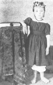A Present to the ''Hired Girl" This is a picture of Clara Dore, daughter of John S. Dore, who built the mansion on Pleasant Ridge. It is loaned by Emma Riedel, and came to 'her from her mother, Susan, who was "the hired girl" in the Dore family. The fact that Susan was given this picture is evidence of that warmth of relation which existed between the members of families and "hired girls" of- the olden days. They were valued members of the household, who loved the children and were loved by them. This picture is a revelation, perhaps the most interesting of all the pictures presented here. Note that Clara was all dressed up for the picture, but was barefoot. She wore pantalettes, as is amply evident. Her little hat caps the climax. On the floor behind her is an object, understood only by old-timers. It is the base of a contrivance used to keep the subject still during a photographic exposure. From the base extended upwards a slender metal rod, upon which ran up and down a fork- like gadget which fitted around the base of the subject's head and was held in position on the rod by a thumb screw. Thus re-enforced the subject could be kept still during the long exposure of early photography.