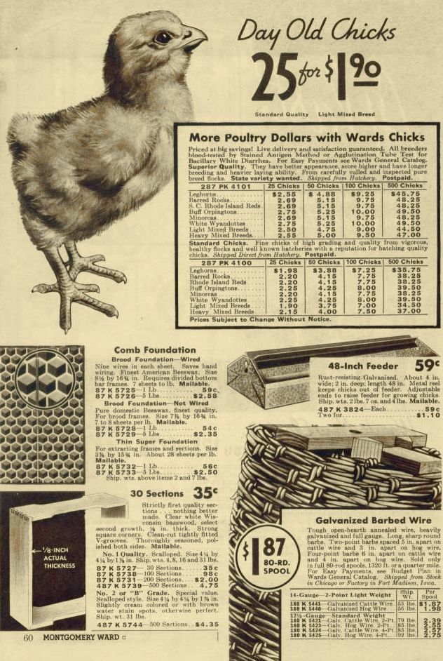 Was that ever a peeping choir when you walked into the store, as everybody's chick would arrive on the same day and we'd all get notices to come pick up the chicks which were sent 100 to a box. We usually had 100 percent survival of the chicks but once in a while one or two would die enroute. The boxes of chicks were stacked one on top of another at the store. I think they still ship chicks today, but they certainly aren't delivered to the post office! I have no idea how many boxes there were, it seemed like a lot to me, but then; that was when I was much younger.