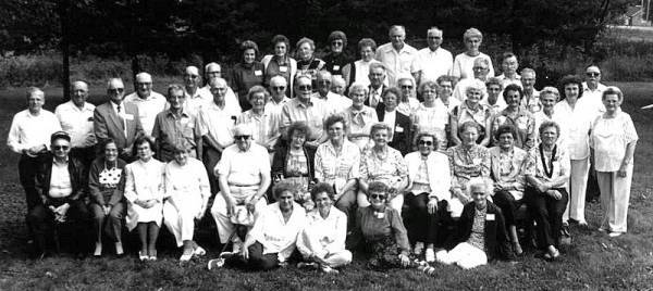 Former students and teachers attending Sunday's North Willard School Reunion were (from left) on ground: Mary (Snedic) Djubenski, Mayme (Gregorich) Kezele, Olga (Ule) Hribar, Anne (Snedic) Horvat. Seated: Lloyd Zupancic, Mary (Lucas) Kohl, Josephine (Jordan) Ryona {teacher}, Caroline (Zupancic) Polbicki, Joe Gregorich, Julia (Kocyon) Stratlow, Mary (Luzovec) Novak, Donelle (Marincic) Wolf, Angeline (Trost) Moore, Mary (Plautz) Burmeister, Helen (Plautz) Albright. Row three: Edward Uhle, George Plautz, Frank Koschak, John Snedic, Jennie (Koschak) Krapf, Frank Peroshek, Rose (Peroshek) Salakar, Frieda (Ticer) Benjamin, Sophie (Plautz) Matkovich, Ann (Kokaly) Boh, Mary (Jelercic) Raik, Angeline (Plautz) Levesque, Bernice (Rotcon) Boh, Emil Plautz, Matt Gregorich, Stephanie (Cerne) Cohara. Row four: Albert Trost, Albert Bukovec, Bill Petkovsek, Frank Petkovsek, Darwin Kokaly, Joe Plautz, Ludwig Jordan, Frank Artac, Mary (Koschak) Lesar, Dorothy (Petkovsek) Gregorich, Leo Gregorich, Mary (Jelercic) Raik, Frank Urbanz. Row five: Alice (Ule) Braun, Christine (Gregorich) Bukovec, Vicki (Buckovec) Krultz, Rose (Plautz( Pakiz, Sylvia (Jelercic) Yurkovich, Edward Perkol, Frank Petkovsek, Margaret (Urbanz) Plautz.