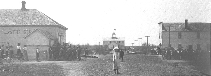 Perhaps promotors or maybe a Fourth of July brought crowds to Main Street in Columbia. The Bee Hive on the left was the first store and post office. On the right was the second store with the school house in the distance. |