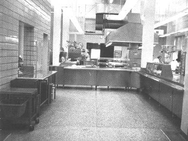 The rooms of the inmates are light and airy and comfortably furnished with a good bed, rug and radiator. Every room in the three wings is an outside room, so that there is not a dark room in the entire building, with the result that the patients at the institution will be cared for in the most pleasing manner and under conditions which should be of vast benefit in their ultimate cure or relief. Each of the two patients' wings, open through a connecting stairway to the dining room, the auditorium and to the hospital. At the rear of the dining hall is the kitchen (the kitchen as it looked in 1972), which is a particularly efficient one. It contains its own bakery, its own refrigerating plant and other labor saving aids (photos). Elevators in each of the right and left wings run from the first to the third floors. There is no basement in the building, construction being started on the ground. Tunnels, however, conduct the steam pipes, the wiring, etc., beneath the first floor.
