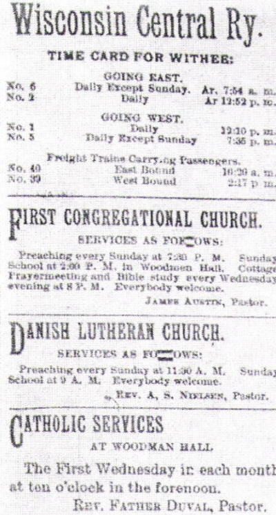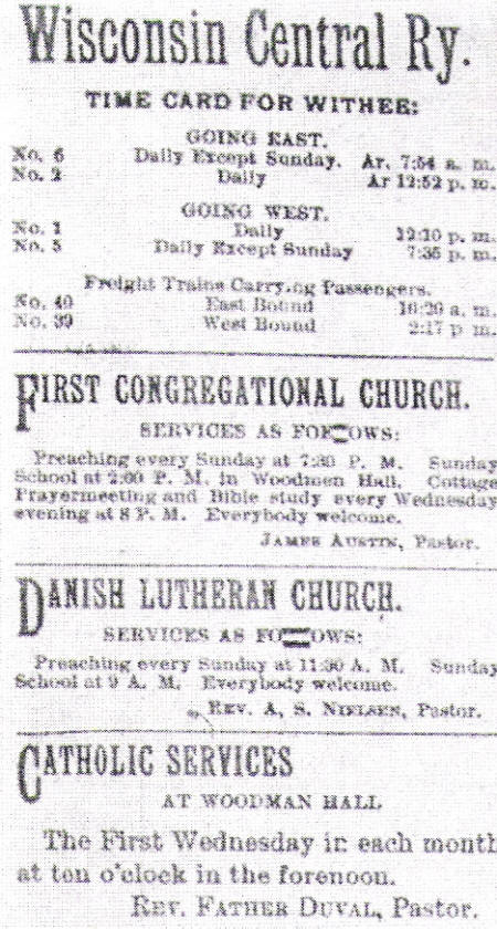 Weekly columns included "Condition of Crops", "Events of the Week" and "Wisconsin State News". Other weekly items include church service listings and the Wisconsin Central Railway time card.