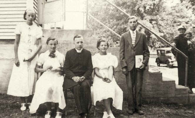From Left:  Miss (Miriam?) Hamalainen, Sarah Makkonen, Pastor George Autio, Gertrude Puro, and Walter Eloranta.