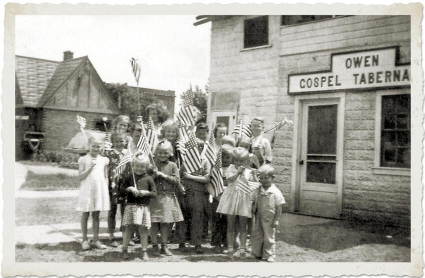 is our mother Amy (Smith) Teach Front row, far left: Vida Teach in a light color dress with braded pig tails I "think" I'm in there but hidden by heads and flags. This church building was owned by a great city policeman, Henry Riegel, and his wife. It was located on old highway 29, between a Texaco station and the county garage. Lillian Jensen served as the pastor. Prior to becoming a church, this building had been in the big flood and inside a water line could still be seen after its conversion. Mr. Riegal would pick us up in Curtiss and bring us to church and I have very fond memories of my time in Owen, Wisconsin. Jerry Teach |