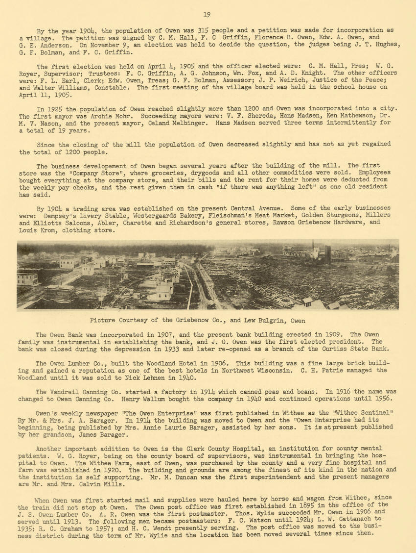 In 1925 the population of Owen reached slightly more than 1200 and Owen was