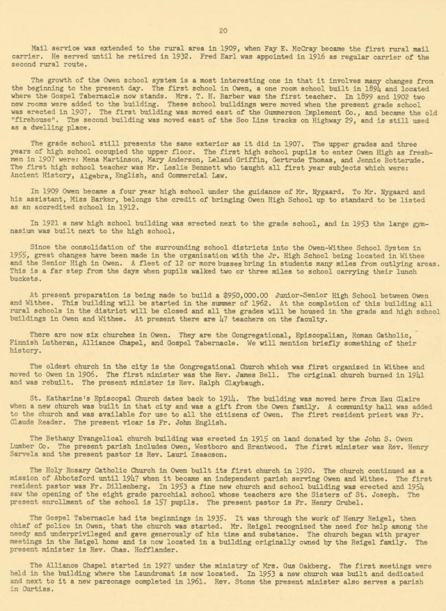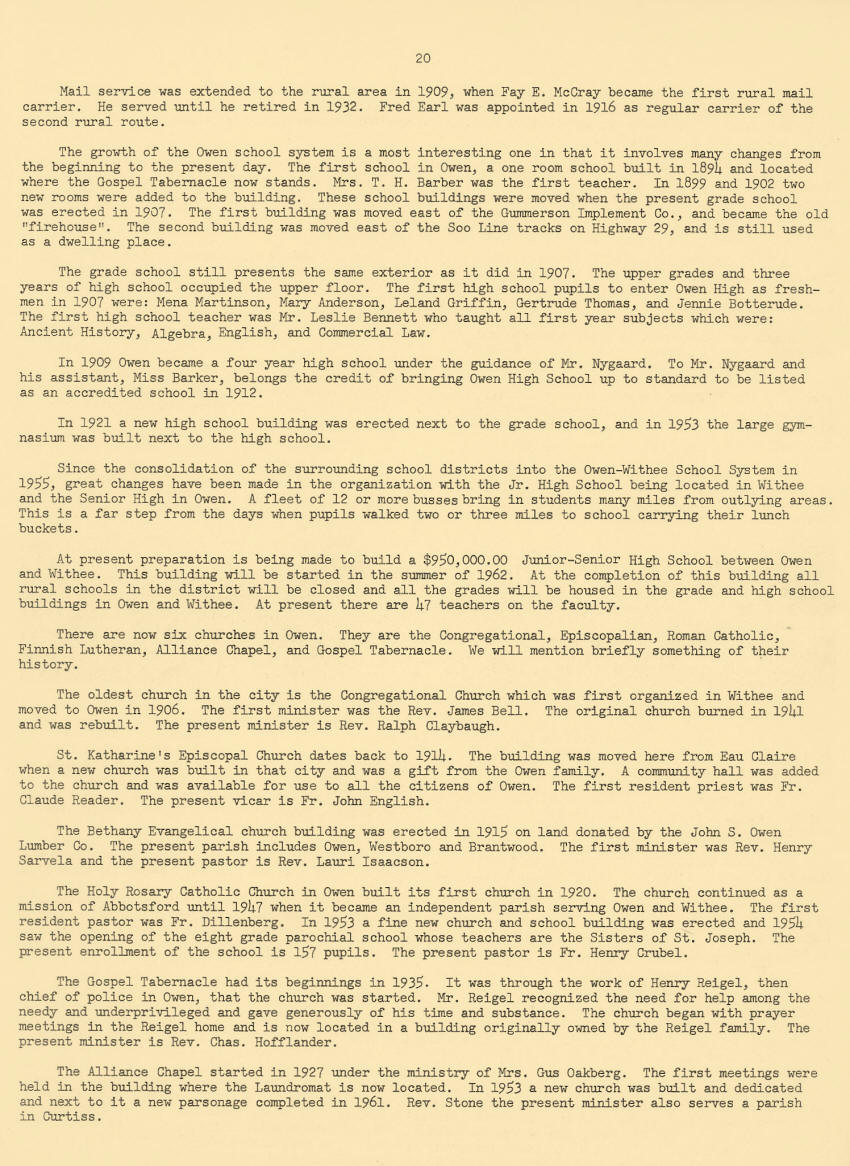 the John S. Owen Lumber Co. The present parish includes Owen, Westboro and