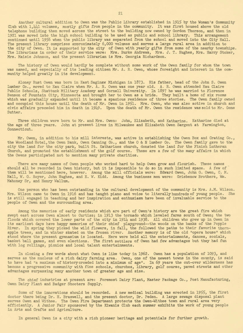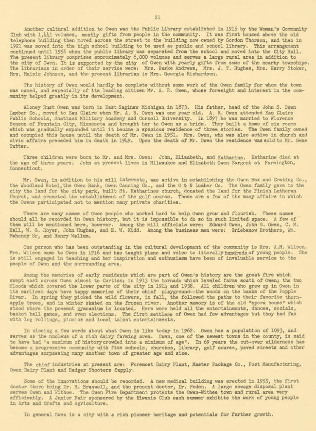 Dr. Peden. A large sewage disposal plant serves Owen and Withee. The Owen Fire