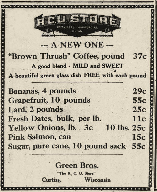 March 25, 1931 "Curtiss Advance" Advertisement for Green Bros. "R.C.U." (Retailers' Commercial Union).