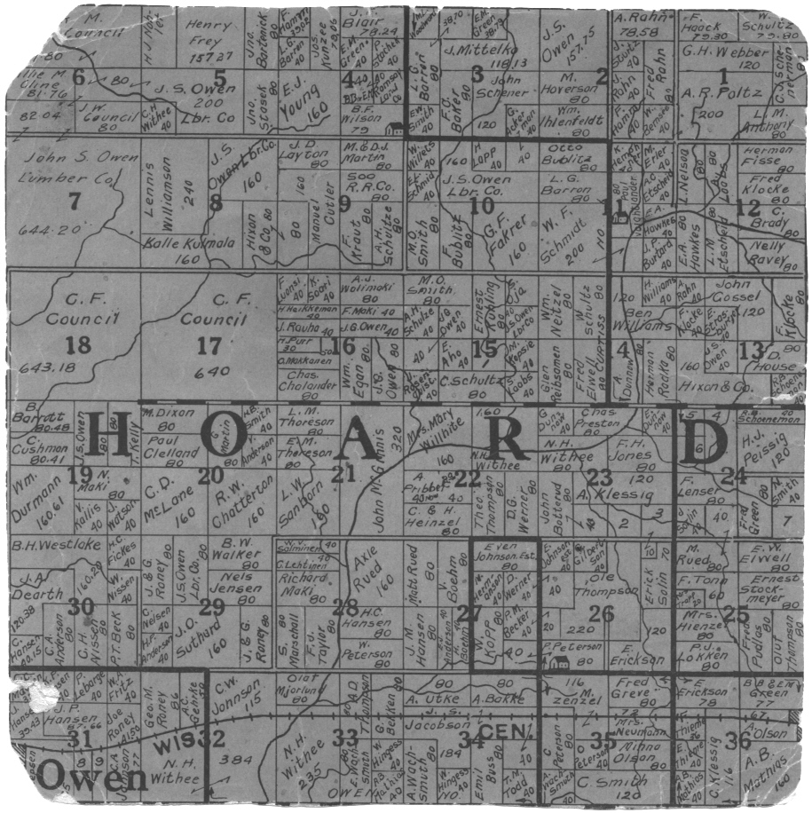 1938 Hoard Township Property Owners-- T.B. Peterman; C. Lehtinen; A.E. Stadler; W.C. Carlson; State Bank of Owen; Ferd Hingiss; Anna Miolund