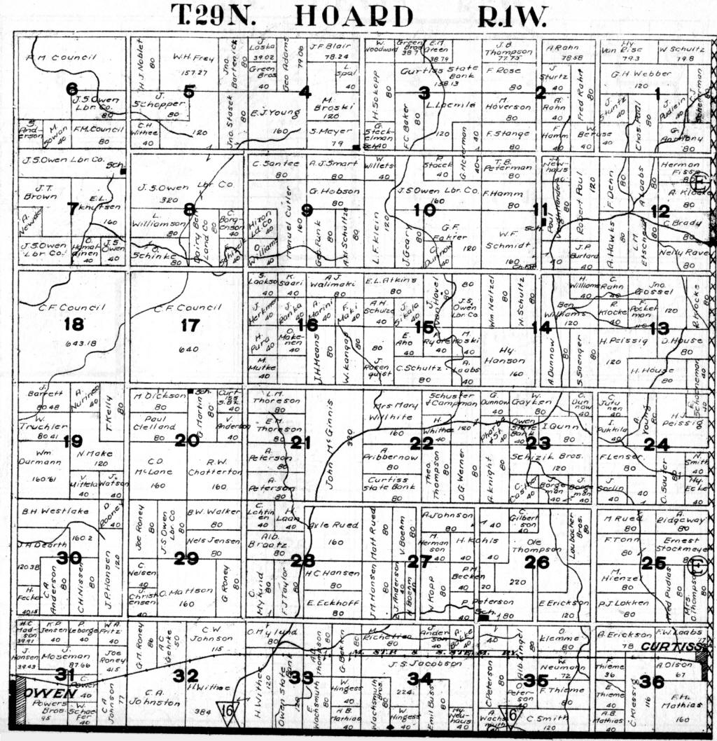 1938 Hoard Township Property Owners-- Wm. Schaefer; J.S. Owen Lmbr. Co.; M. Cutler; F.W. Buss; R. Martin; Olef Williams; Herb. Elroy Schulze; Aug. Schulze