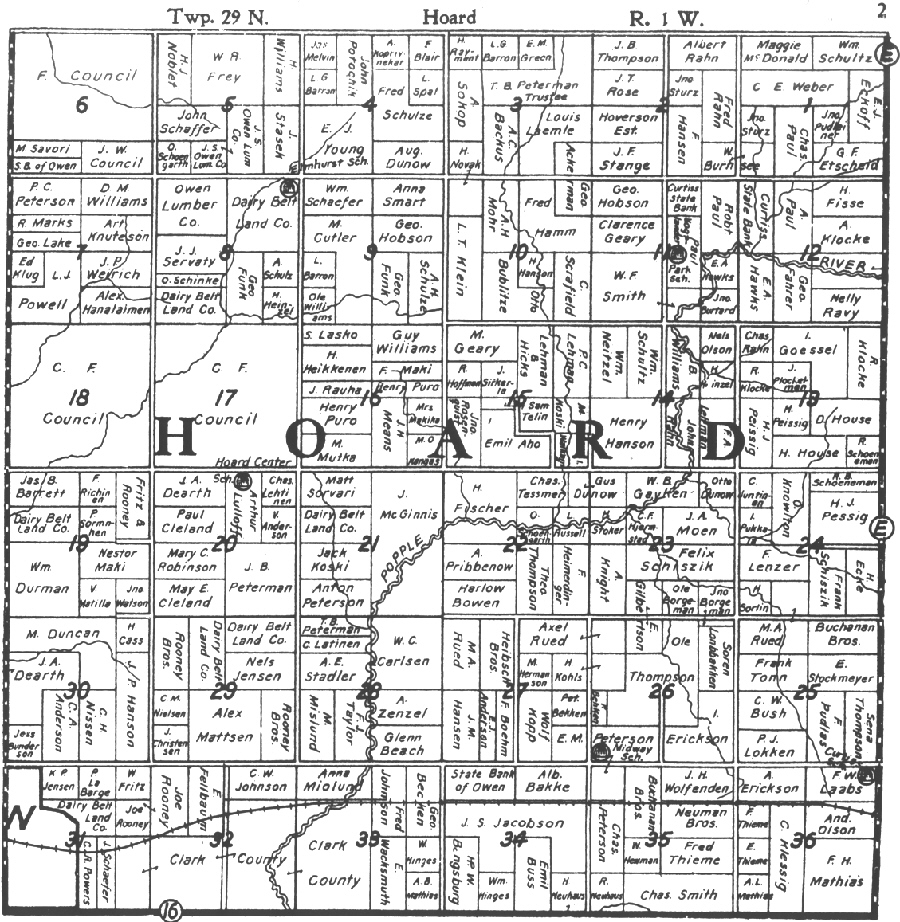 1956 Hoard Township Plat Map--Ben & Eliza Holiday; George & Annie Shelton; Walter & Mary Samek; Owen Lumber Company; Inez Goodwin & W. Jones; Herman & M. Gemuenden; Emil & Turner Makinen; Peter & Caroline Kaz.