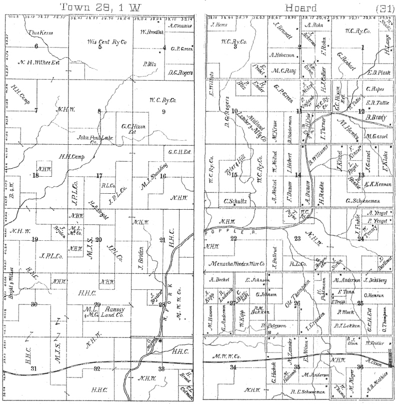 1938 Hoard Township Property Owners-- C. Juntinen; ?. Pukkila; H.H. Fiebig; R.B. Schoeneman; H.J. Peissig; F. Lenzer; H. Sorlin; A. Rued; Frank Schiszik; Aug. Ecke