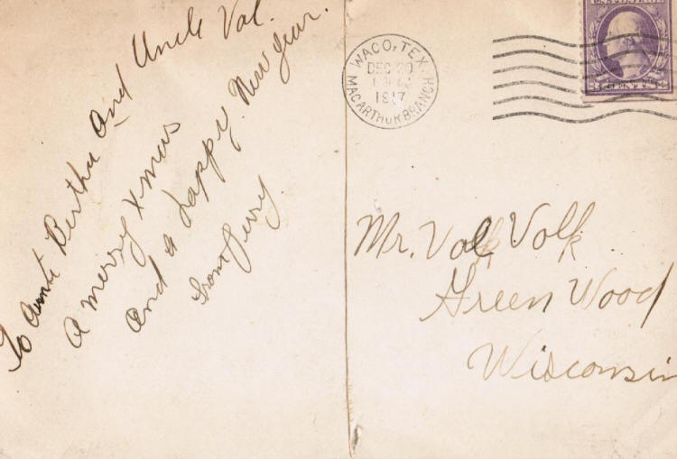 son of Jacob Volk. Card sent on December 20, 1917from Waco, Tex;