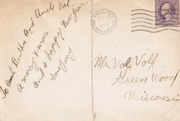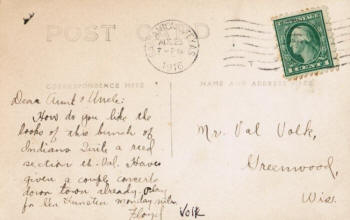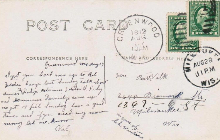 Post card sent by Val Volk to wife Bertha while she was visiting in