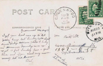 Post card sent by Perry Volk to Mr. Val Volk, Greenwood Wisc: Perry,