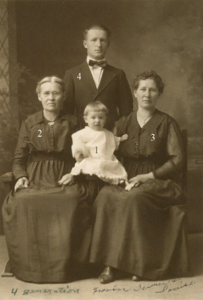 10 1. Minnie Haseleu Tesmer, 2. Louise Tesmer Pribnow, 3. John Pribnow 4. Wavaglee Pribnow Miller. (ca. 1919-20) |