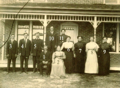 23 Family of Paul Tesmer, Sr. (ca. 1910) 1. Paul Tesmer Sr. 2. Minnie (Haseleu) Tesmer 3. Herman 4. Paul Jr. 5. John 6. William 7. Louise Pribnow 8. Gustie Olson 9. Minnie Fricke 10. Annie Orth 11. Bertha Dahlke (The family home in Colby, WI is in the background) |