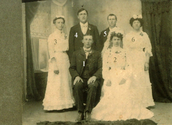 6 Ted Lueloff-Ida Augustin Wedding, 25 Nov 1903 by Lukowicz Studio 1. Ted, 2. Ida, 3. Hattie Singstock, 4. Wm. Tesmer, 5. John Miller, 6. Sophie Augustin |