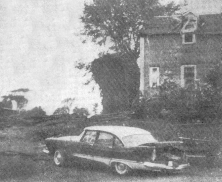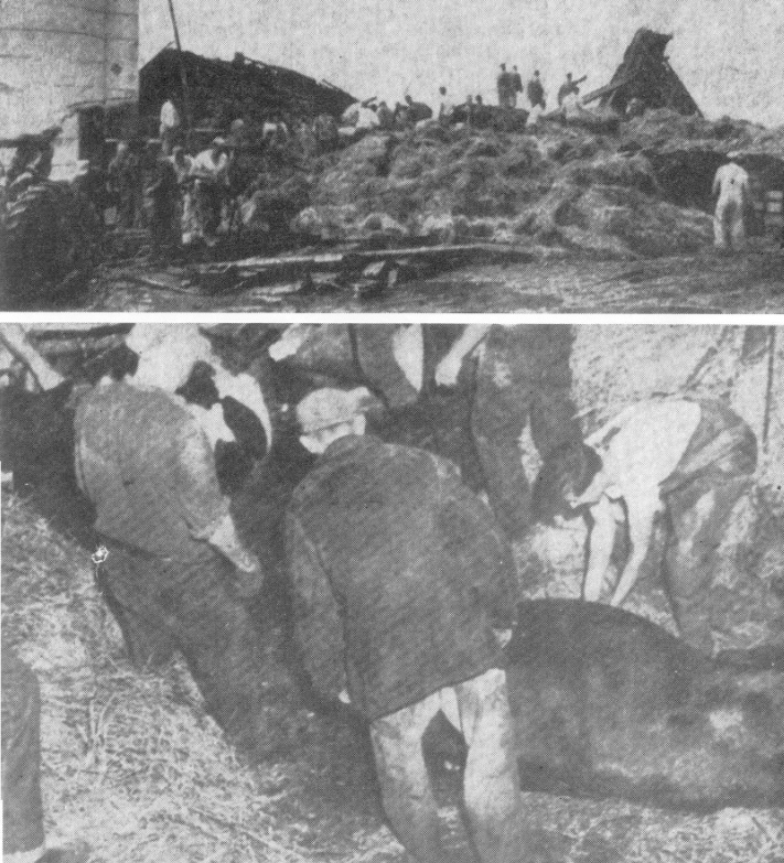 A violent windstorm early Sunday night battered the Longwood area in northwestern Clark County. Heaviest damage was reported on the farm of Mrs. Walter Ruggles, where a barn (top photo) collapsed while the owner and her 20-year- old son, Jerry, were inside the building. Both escaped unhurt, but 10 of the 19 cows in the barn were killed by failing timbers and others were injured. Volunteer rescue workers are pictured below assisting injured and trapped animals from the debris. (News- Herald Photos)
