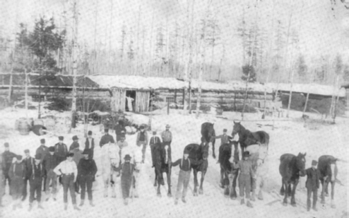 This picture was taken about the same time as the others. This is what the logging camps looked like back around 1883. The men worked in these camps all winter the camps were makeshift buildings with no conveniences. The winters were long, but they were so tired when the day was over most of them went to bed shortly after supper, as they arose early and worked a long day in the cold. |