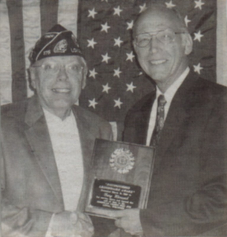 A 90-year anniversary celebration was held March 21 at the Loyal American Legion. Commander Pete Rinka (left) awards Legion member Gary Weirauch the distinguished “Legionnaire of the Year” award for his many hours of helping the Legion with its various projects and fundraisers. (Contributed Photo)