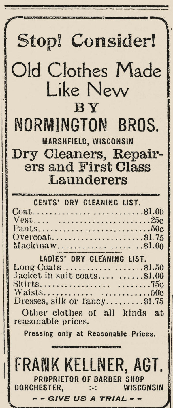 Frank Kellner's Barber Shop & Normington Bros. Dry Cleaners 1916 Dorchester, Wisconsin Herald