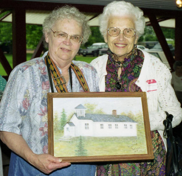 My mother, Helen Johnson, who took up oil painting after her children were older, painted this picture of Hilltop School. It was given as a door prize and won by my cousin, Charlene (Lapp) Stoiber who had organized the reunion. How fitting is that! (Charlene on the left; Mom on the right.) |