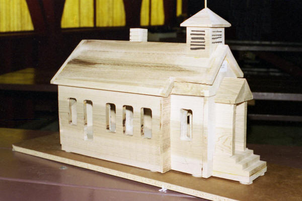 On July 2, 2000, there was a reunion for anyone who had attended Hilltop School. For the occasion, Bernie Staab built this model of the school. Bernie had been a student (1924-25 photo) and was an accomplished cabinetmaker and woodworker.