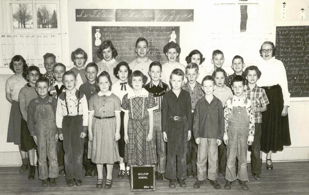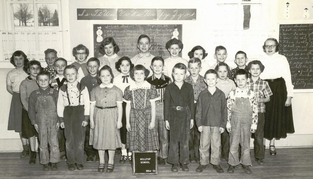 Class of 1954-55 Back Row: Jane Beisner, Harold Ausmusson, Dianne Schultz, Linda Johnson, Gary Hoffman, Janice Plockelman, Linny Carlson, Ole Johnson, Victor Plockelman, Miss Esther Bloom. Middle Row: Theresa Drinka, Roger Schultz, Dale Geiger, Myrna Beisner, Gerald Gumz, Harlan Larson, June Geiger, Beverly Plockelman. Front Row: Douglas Gumz, Terry Miller, Stella Hoffman, Mary Ellen Beisner, Robert Carlson, Clifton Gipp, Eddie Geiger.