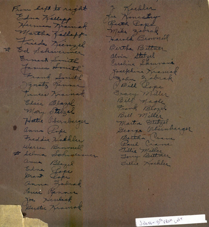 The names written on the back of the photo are: Edna Kallepp, Herman Krainak, Martha Kallepp, Frieda Kienzel, Ed Schwermer, Ernest Smith, James Smith, Frank Smith, Ignatz Renner, Frances Krainak, Elsie Blazel, Mary Stelzel, Hattie Obernberger, Anna Pope, Freddie Holhler, Warren Brownell, Selma Schwermer, Anna Blazel, Edna Pope, Grant Pope, Anna Zobrak, Louise Renner, Joe Henlick, Gustie Krainak, J. Koehler, Joe Konectry, Ruth Pope, Mike Zabrak, Harold Brownell, Bertha Bittner, Caroline Skruvane, Josephine Kraniak, John Zabrak, Bill Pope, Tracy Miller, Bill Nagle, Frank Blazel, Bill Miller, Martin Stetzel, George Obernberger, Bertha Crane, Paul Crane, Tillie Miller, Tony Bettner and Tillie Koehler.