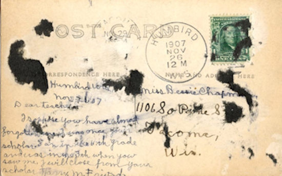 The postcard was sent to Bess by a former student, Harry M. Fristad. He was 11