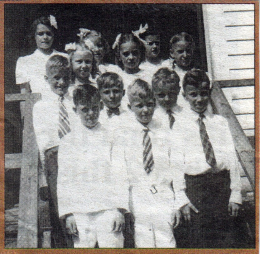 First Communion class of 1943 poses for its photo: Pictured are (l-r) Beverly Savage, Beatrice Hansen, Shirley Radcliffe, Donna Rozmenoski, Berdine Martin, Elisie Montay, Peter Barkely, Fred Bauer, Duane Bowen, Donny McCormick, John Fry and John Quartemont.