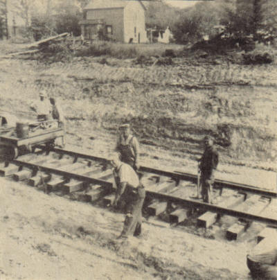 THE TEMPORARY TRACK, being laid north of the collapsed Green Bay & Western Railroad Bridge on East Hall’s Creek in Merrillan, is expected to be completed by mid-week.