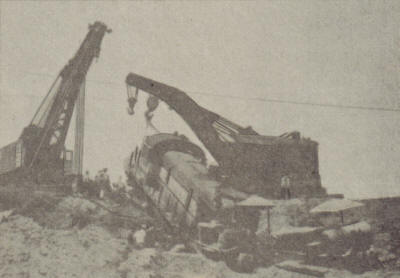 Green Bay & Western section men, assisted by wreckers from the Soo Line and Chicago & Northwestern Railroad, and two D-8 caterpillars worked two days to raise a 250,000 pound engine from its resting place down a 40 foot embankment.